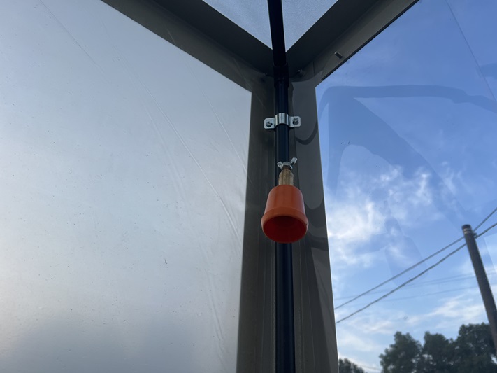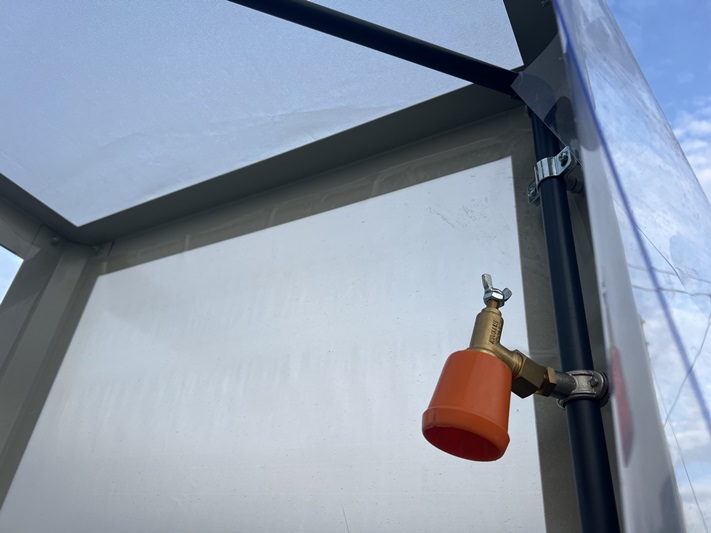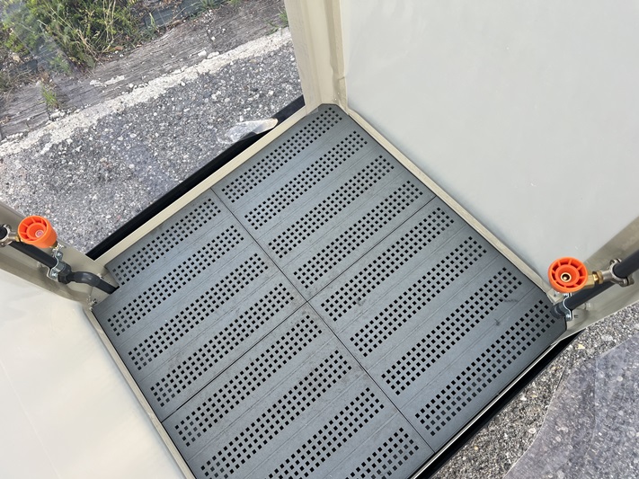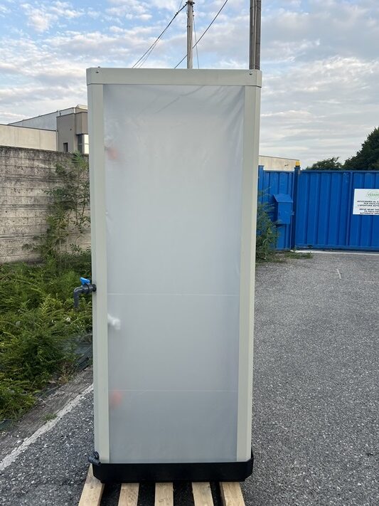È dotata di due coppie di ugelli (getto a farfalla) poste dall’alto al basso e dal basso all’alto, per nebulizzare e raggiungere tutte le superfici del sacco da decontaminare e costituita altresì da un’ampia vasca per la raccolta e filtrazione delle acque contaminate.