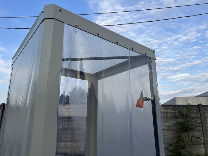 DECONTAMINAZIONE E GESTIONE ACQUEUNITÀ REALIZZATE IN CANTIERE - ACCESSORIUnità di Decontaminazione per i Materiali costituita da un comparto di lavaggio con intelaiatura in acciaio verniciato a polveri e pareti costituite da teli in polietilene e porte con flap in PVC trasparente