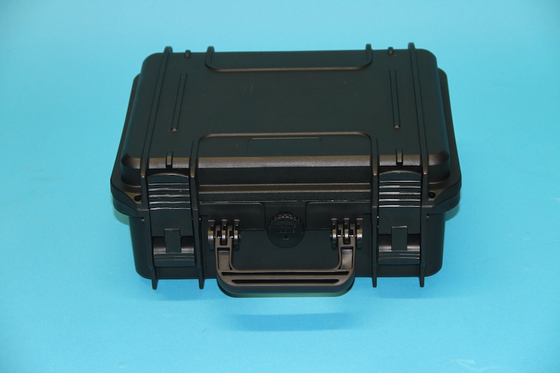 Valigetta in polipropilene di colore nero, con espanso prefustellato e dispositivo automatico di pressurizzazione per contenere campionatore, caricabatterie, tubo di collegamento, portamembrana e materiali per il campionamento